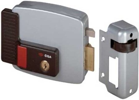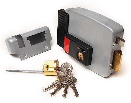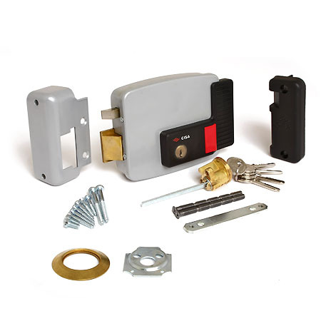 Накладной замок производства Италии, открывается вручную снаружи ключом, изнутри нажатием на кнопку или подачей питания.